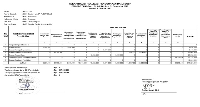 Melalui rekapitulasi ini, dapat diketahui kesesuaian antara anggaran yang direncanakan dengan realisasi penggunaan dana, serta sisa dana yang masih tersedia. Rekapitulasi Realisasi Penggunaan Dana BOSP ini disusun sebagai bahan evaluasi dan pertanggungjawaban kepada pihak terkait serta sebagai dasar perencanaan kegiatan pada tahap atau periode selanjutnya.